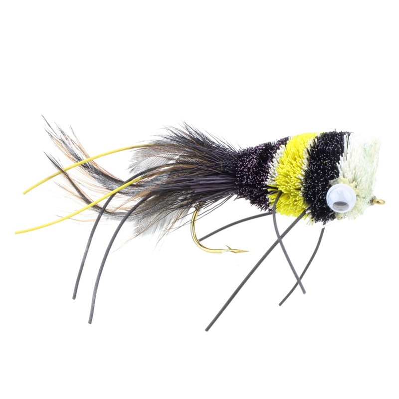 Experience the awesome excitement of catching a big bass with a surface fly OR get one just because they look so cool in your fly or tackle box. This fly has colored rubber legs and a weed guard. Features Pattern: Black, Yellow and White Deer Hair Popper C
