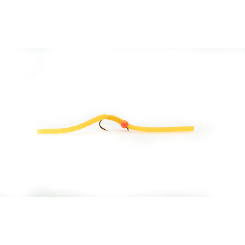 The Orange Squirmy Worm is one of the brighter variations of the Squirmy range. With it’s fluorescent yellow bead and orange body this brightly coloured fly is best used in dirty water conditions. The Orange version we have found to be effective when fished with a short jerky retrieve and of course when fished under aFario Bung.